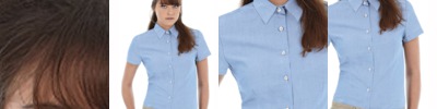 Soft feminine collar. Cross stitched mother-ofpearl effect buttons. Short sleeves with narrow cuffs. Darts at bustline and back panel for a feminine shape. Horizontal last buttonhole.